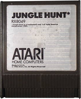 Jungle Hunt (1982) sur Atari 400 / 600 / 800 / XL / XE, en cartouche ROM. Ce jeu de plate-formes à défilement latéral vous permet de contrôler un explorateur dans la jungle à travers 3 niveaux différents aux graphismes colorés et variés (pour l’époque), dont le contenu varie selon une difficulté réglable : en bravant des dangers tels qu’alligators et singes, sautant de liane en liane ou nageant sur une rivière, il vous faudra sauver une belle exploratrice de méchants cannibales. Excellent jeu.