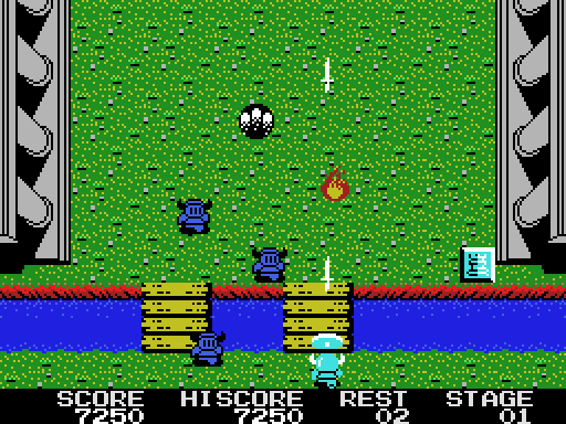 Dans ceux-ci, vous incarnez le rôle d’un preux chevalier en armure, qui répond au nom de Popolon. Dans le premier de la série, ce dernier va donc explorer une multitude de lieux (8 niveaux) qui défileront depuis le haut de l’écran, en prenant bien garde de pouvoir : 1. amasser le plus grand nombre possible de bonus, ces derniers servant à décupler sa puissance de frappe, ou à lui offrir quelques pouvoirs (limités, comme une invisibilité temporaire) ; 2. tuer (ou détruire) le plus d’ennemis possible, ces derniers arrivant en masse et en suivant des trajectoires complexes, mais toujours fatales. Ainsi, peut-être Popolon pourra-t-il retrouver sa bien-aimée Aphrodite, la célèbre déesse de l’amour et de la guerre (sic).
