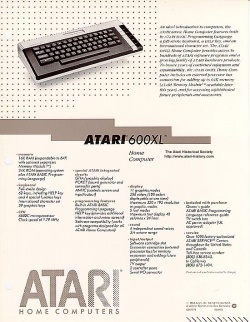 Ensemble comprenant un ordinateur personnel Atari 600XL, son câble vidéo (PAL), son alimentation, le guide de l'utilisateur Atari 600 XL, le manuel du langage Basic Atari et une feuille « Comment brancher votre ordinateur Atari (PAL) », le tout dans l'emballage d'origine (une grande boîte en carton argentée illustrée de photographies en couleurs avec ses polystyrènes).