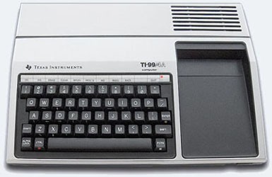 Micro-ordinateur Ti99/4A de 1982, reconditionné par nos soins, avec son alimentation externe, câble et convertisseur A/V Péritel RVB, 2 manettes de jeu Texas Instruments, manuel d'instructions et un jeu en module ROM.