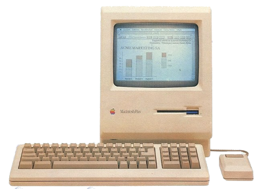 Ensemble reconditionné par nos soins comprenant un micro-ordinateur Macintosh plus d’Apple (microprocesseur Motorola 68000, lecteur de disquettes interne 800 Ko, écran monochrome 10