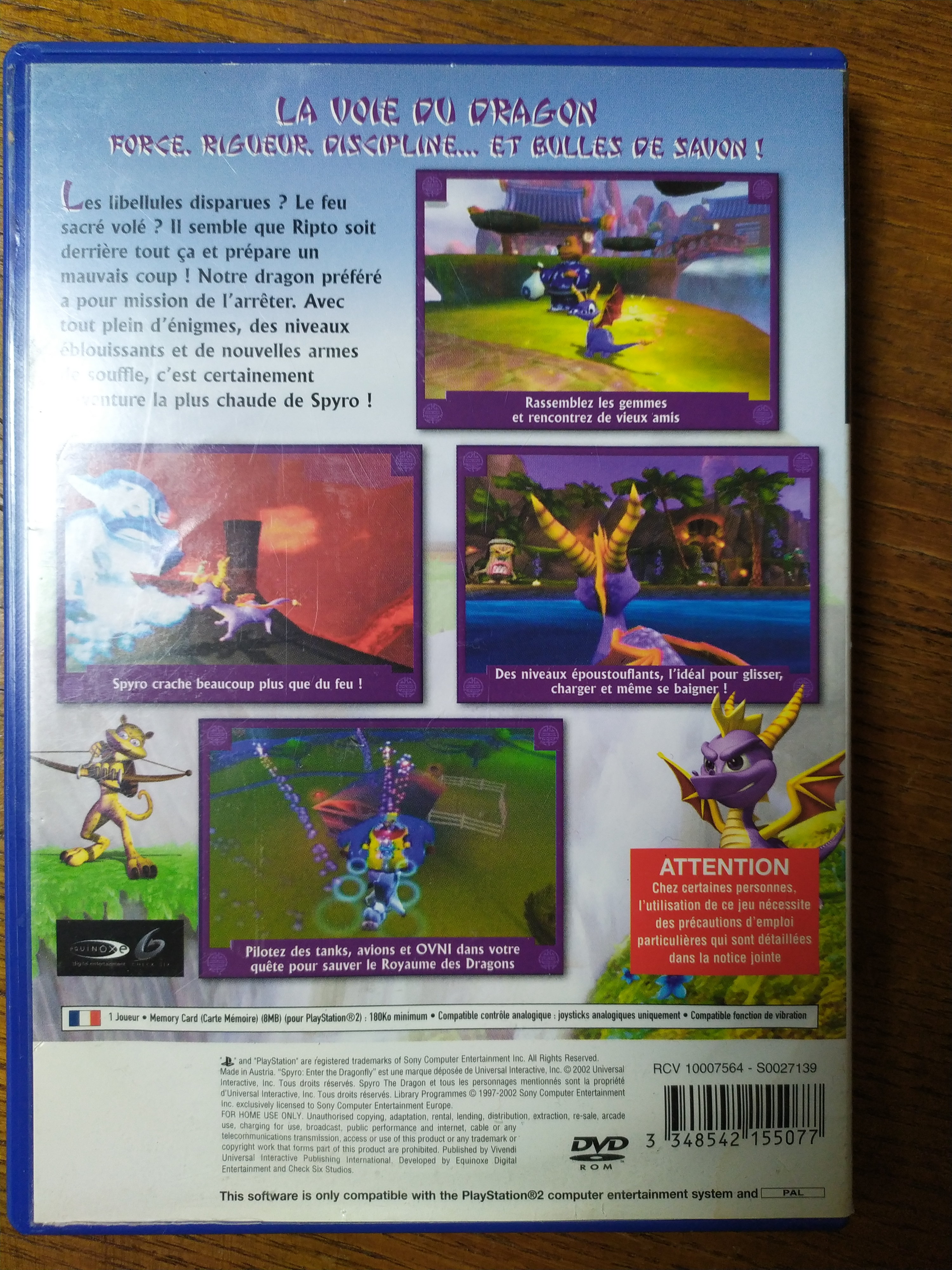 Spyro Enter the Dragonfly est le premier volet de cette série emblématique sorti sur Sony Playstation 2 et le premier à ne pas avoir été développé par le studio d'origine (Insomniac Games) : développé par Equinoxe Digital Entertainment, placé sous la houlette d'Universal Interactive et sorti à la hâte en 2002, le jeu reçut un accueil mitigé par la critique, cette dernière déplorant l'absence de renouvellement de la série et des graphismes jugés trop simplistes pour la PS2. Au niveau de la jouabilité, Spyro bénéficie désormais de nouveaux souffles (glace, bulles d'air, etc.) avec lesquels il lui faut jongler pour réussir à passer les courts niveaux du jeu.