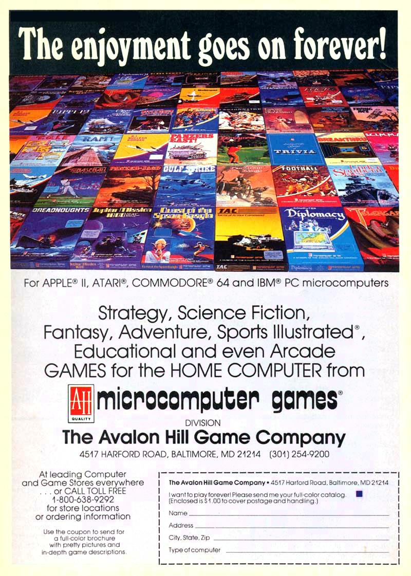 Avalon Hill est également devenu un éditeur de jeux vidéo pour ordinateurs à partir de 1980 : à côté de nombreux titres de simulation directement adaptés pour TRS-80, Vic-20, Commodore 64, Apple II, ou encore, pour IBM PC depuis les versions sur plateau, son jeu le plus célèbre est certainement Telengard (1982) : ce dernier a ses racines dans le premier dungeon crawler informatique, écrit en BASIC sur PDP-11 en 1976-1977 par Daniel Michael Lawrence.