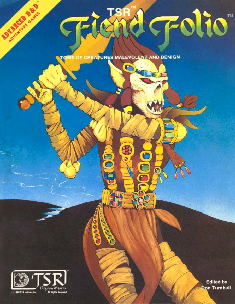 L’essentiel de son contenu provient du magazine White Dwarf, certaines illustrations des créatures ayant été auparavant publiées dans les modules (scénarios) de TSR. Celles-ci ont été conçue par Stross, Ian Livingstone ou Tom Moldvay, entre autres. Les illustrations intérieures sont de Chris Baker, Jeff Dee, Emmanuel (auteur de l’illustration originale de couverture), Albie Fiore, Alan Hunter, Russ Nicholson, Erol Otus, Jim Roslof, David C. Sutherland III, Bill Willingham, Polly Wilson et Tony Yates. D’une manière générale, le Fiend Folio propose des adversaires originaux, moins « classiques » que ceux du Monster Manual.