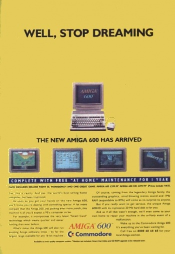 L’intention de Commodore International était de faire remonter ses ventes dans la gamme A500 avant la commercialisation du nouveau modèle A1200. L’A600 mesure 35cm de long sur 24cm de profondeur et 8cm de hauteur, pour une masse d’environ 3kg. Il est pourvu d’origine d’une ROM Kickstart / Workbench v2, d’un lecteur de disquettes 3,5” intégré et est architecturé autour le processeur Motorola 68000, cadencé à 7.14 MHz (PAL) ou 7,09 MHz (NTSC). Il en a été fabriqué un modèle avec disque dur IDE interne de 40 Mo (dénommé A600HD) qui était vendu pratiquement le double du prix d’un A600 ordinaire.