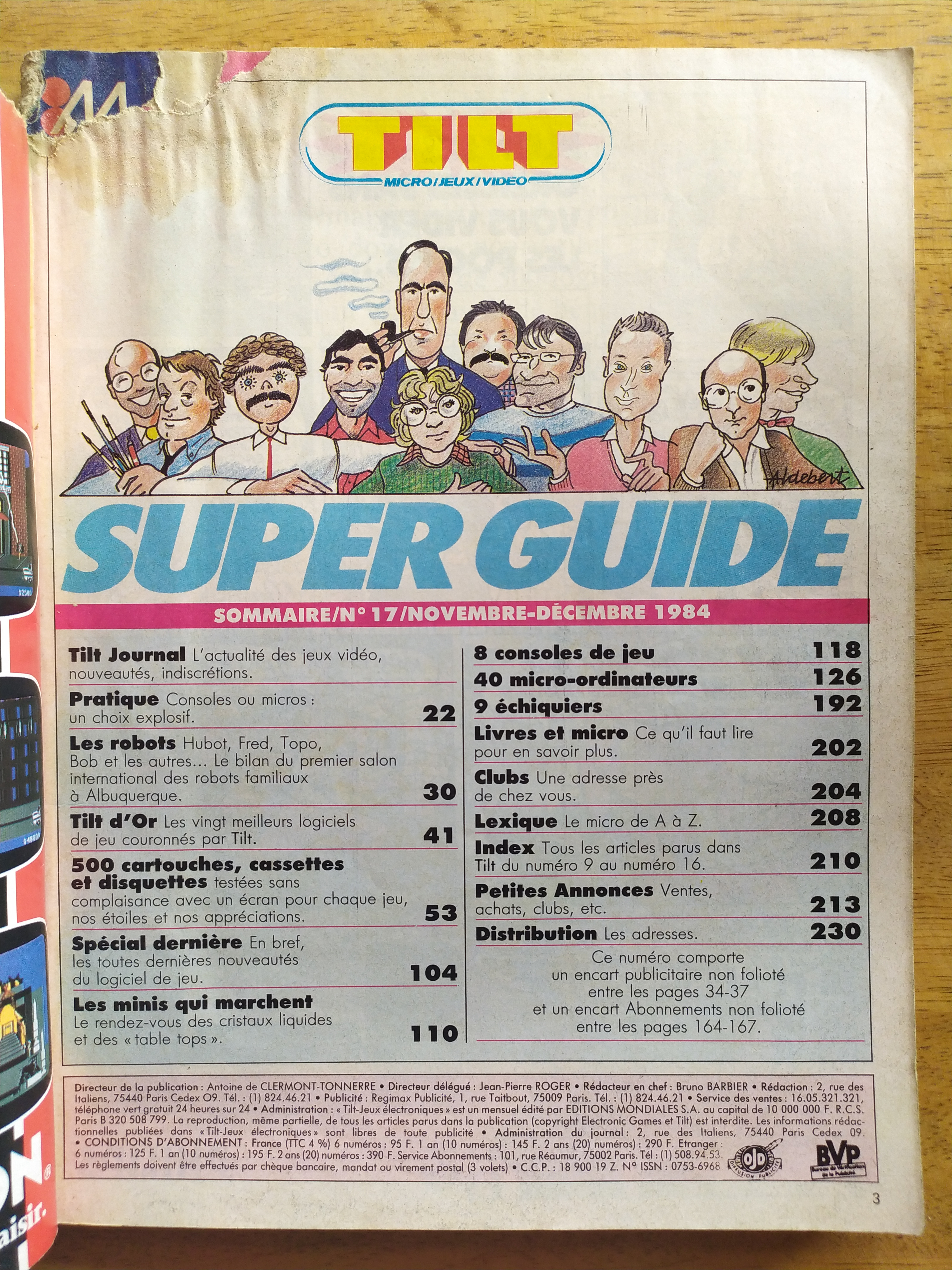 Le magazine Tilt, imprimé en couleurs, fut probablement le plus apprécié des joueurs des années 1980 en France, aux côtés de l’Hhhebdo. Plusieurs numéros sont disponibles : si nécessaire, nous contacter pour en obtenir la liste actualisée.